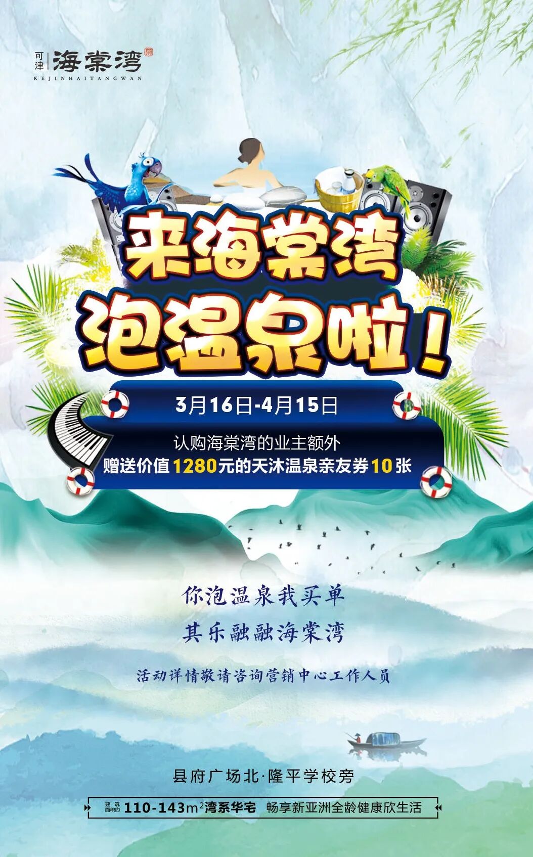 可津·海棠湾又放福利啦 3月16日-4月15日 买房再送10张价值1280元的 天沐温泉亲友券 一起相约庐山天沐 和春天约会吧 庐山天沐温泉渡假村 庐山天沐温泉位于庐山山脚下 晋代诗人陶渊明的栗里故居所在地 距离庐山、东林大佛、秀峰景区 鄱阳湖、白鹿洞书院等景点非常近! 度假村气势恢宏,园外背倚青山 远离都市的繁嚣、大堂典雅大气、中西合璧, 尽显盛世汉唐景象与风情 40多种功能各异的露天温泉浴池 还有加料温泉泡池区 让你温泉与养生的一站式体验 自然园林式的露天温泉区 整体布局保持天然风貌 怡人清新的乡土田园格调 青石板路纵横交错 亭台廊榭,假山瀑布 小桥流水、鸟语花香、绿意葱茏 40多个大小形状不一 功能各异的温泉池坐落有致 一池一景,老少皆宜 自然悦心,让您远离都市的繁嚣 身心舒泰,真正融入大自然 沐浴大自然,享受大自然 可津·海棠湾和你相约庐山天沐温泉,活动日期3月16日-4月15日,业主尊荣专享哦!快来看房吧!