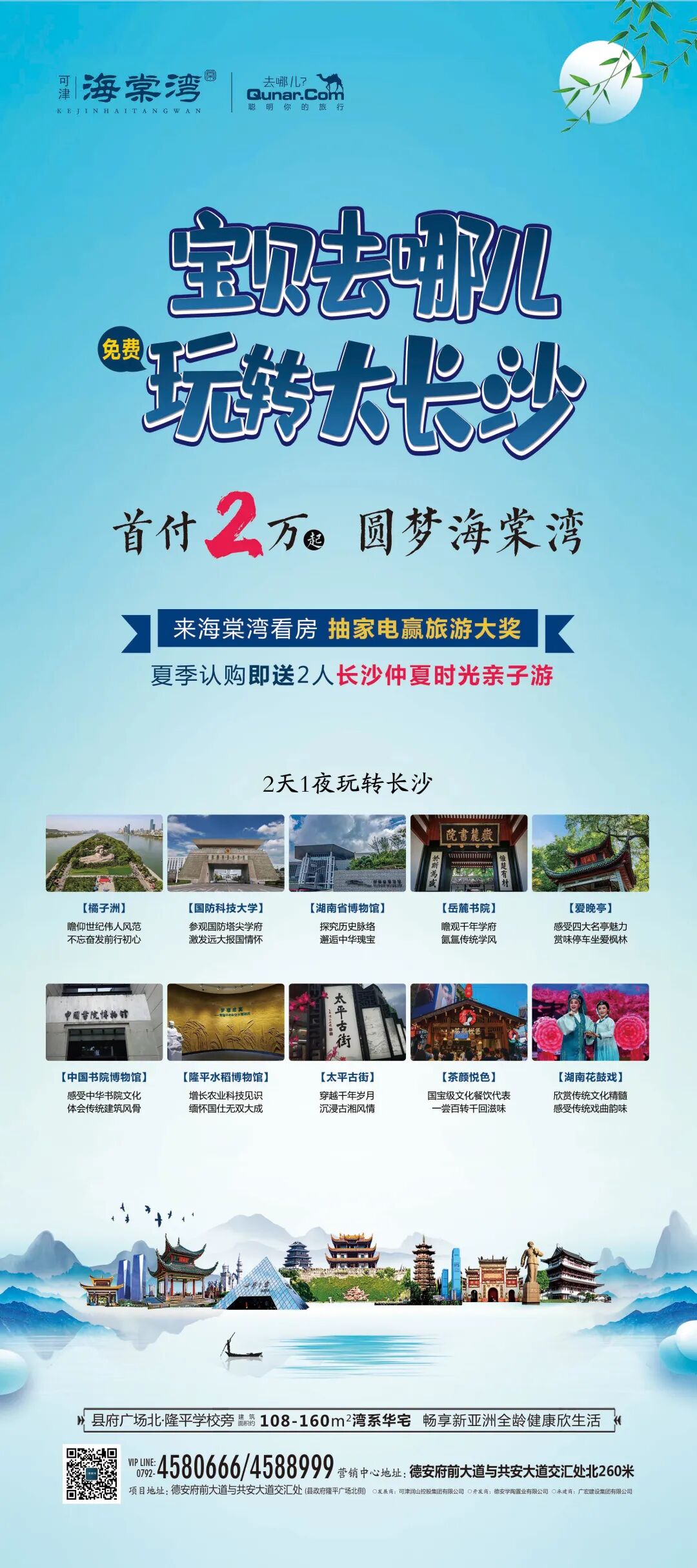虽是炎炎夏日,但那颗想要出去玩耍的心却迟迟静不下来 本着爱TA就带TA去浪的心情 一直暗戳戳的预谋去玩,却被漫天的攻略迷花了眼睛 别急,容易上火~ 海棠湾帮你解决! Vol.1 趣享盛夏 到访有礼 即日起至8月31日 到访海棠湾售楼处看房 即可参与幸运大抽奖 品牌家电、天沐温泉券、雪花啤酒... 这,统统都是前菜 Vol.2 购房赢大奖 任性长沙游 7月31日前 首付2万起 圆梦海棠湾新亚洲星级华宅 认购即送长沙2天1夜亲子双人游 玩遍长沙“洲科史学亭院农街茶戏”十景 访古迹,识新学,尝国茶,品文化 炎炎盛夏日,悠悠亲子游 心动不如行动 一起来海棠湾购华宅赢好礼吧~ 海棠湾8#、12#中轴景观楼座,火热销售中 建筑面积约108-160㎡湾系华宅 畅享新亚洲全龄健康欣生活 湾系星级尊府 品质承托未来 建筑革命让科技生长 景观革命让功能显现 户型革命让生活悠扬 可津“湾”系由此而生 23万方新亚洲全龄健康住区 可津集团湾系代表作 “可津·海棠湾” 值得细细品味 开发实力 集团一体化运作 全明星阵容开发 可津润山控股集团有限公司业务版块涉及工程建设、房地产开发、新型建材研制和生产、高端物业服务管理等多个领域。集团旗下物业服务版块由新广都集团领军,物业集团注册资金5000万元,将打造为全国一流的现代化物业服务管理企业。强大的一体化集团链式开发带来可津·海棠湾专属的全明星开发阵容,品质坚实有保证,选择更安心。 地段配套 择址政务中轴 从容雅俗兼顾 可津·海棠湾位于共安大桥东首,地处主城腹地、政务中轴之上,与九仙岭、县政府、隆平广场呈贯通之势,中正平顺气度不凡。项目周边自然景观得天独厚,项目直面隆平植物园、隆平湿地公园,隆平广场、市政公园、紧邻九仙岭森林公园,“一山一场三公园”,生活如诗亦如画。周边生活配套齐全,学校、医院、超市、菜场、影院、火车站、各类餐饮等环绕周边,区域内路网畅达交通便捷,悠然步行即可轻松达到。 教育资源 毗邻品牌名校 启赋金色人生 项目与“德安三幼”以及德安全力打造的九年一贯制品牌名校——“隆平学校”近在咫尺。目前幼儿园、小学、初中都已投入使用。紧靠名校的房子,当然更有价值提升的空间。而可津·海棠湾更是自带了一所2100㎡的6班制全托幼儿园。小业主甚至不用走出家门,就能享受到优质的启蒙教育。 规划亮点 新亚洲湾系名筑 国际化健康住区 可津·海棠湾以23万方恢弘建城,以新亚洲全龄健康住区精准定位,一展“湾”系高端品质精髓,打造度假行宫般的健康居住感受。项目采取人车分流设计,安静安全。环氧地坪智能地下车库巧妙融合自然采光天井,缔造星级停车空间。项目内部地平比北侧道路抬升约2.5米,地势高呈免于积水潮湿蚊虫困扰,13栋新亚洲格调建筑点式分布优美雅致,18.8%的建筑密度,带来超56000㎡的公共绿色空间,通透舒阔令人心旷神怡。更配载海绵城市系统,为业主提供更为健康舒适的居住生态。