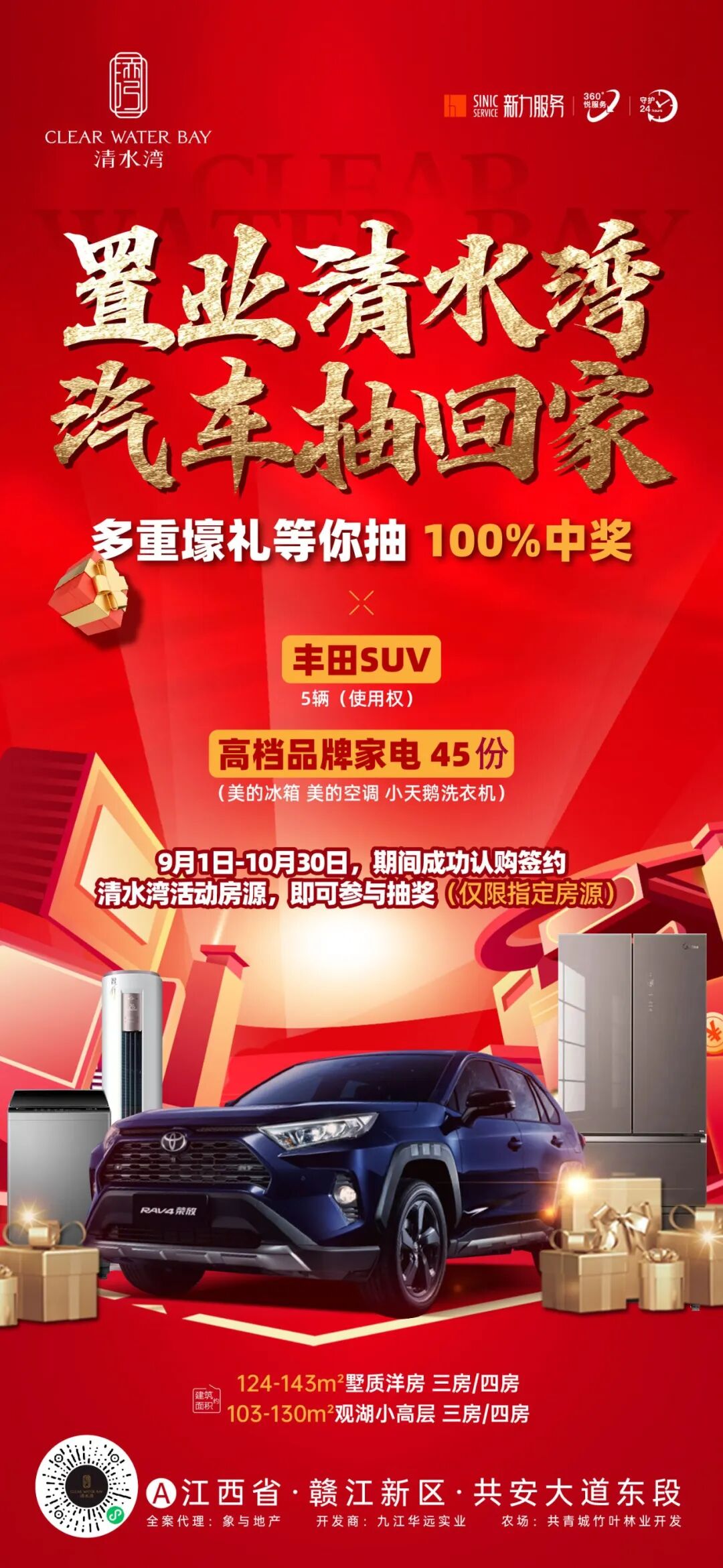 有房有车的幸福,来清水湾就有机会实现!买房抽丰田SUV(指定车型)!让您房车“一举两得”!本次活动奖品除汽车外,还准备了45份高档品牌家电(美的冰箱、美的空调、小天鹅洗衣机)幸福加倍!心动不如行动!